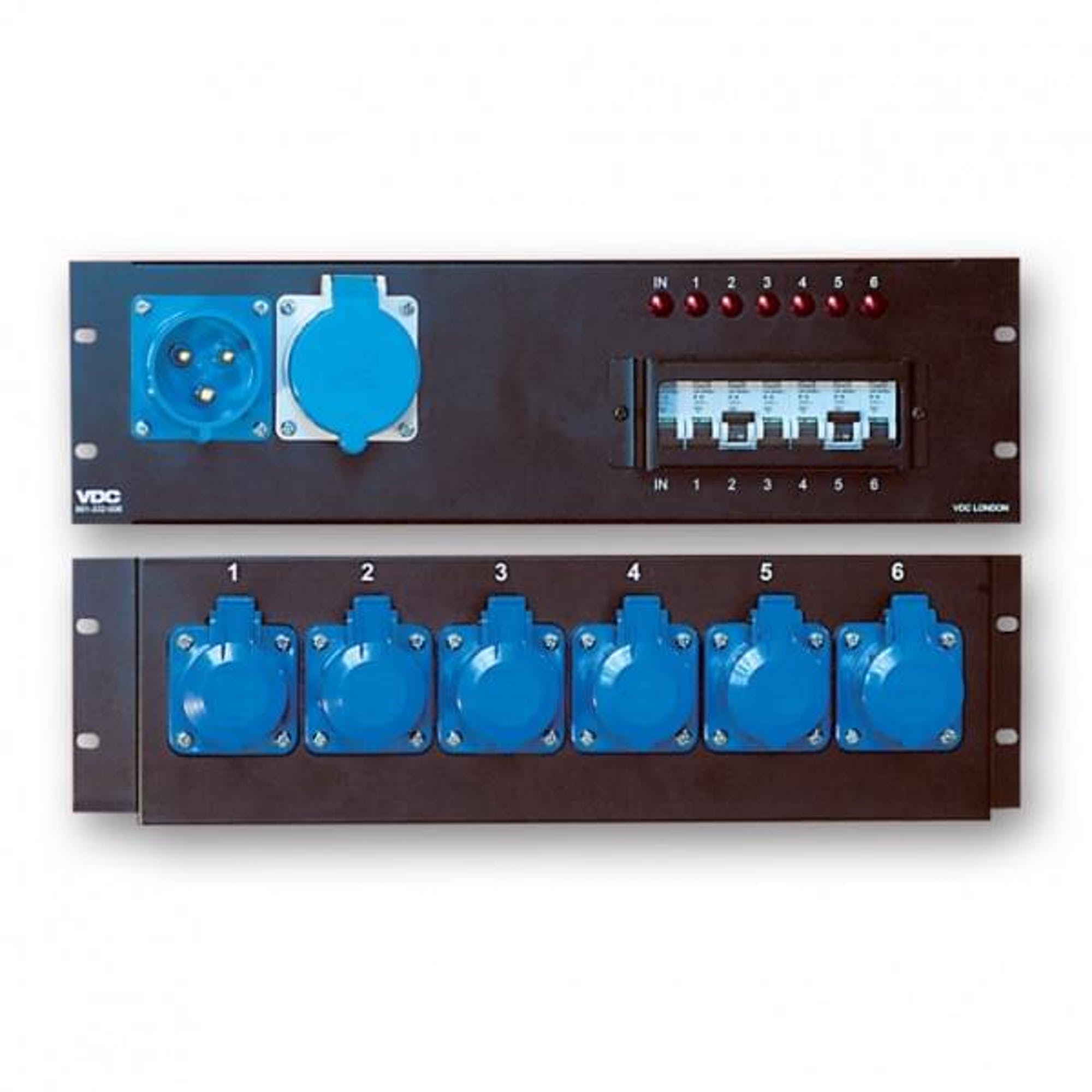 - FRONT: In/Out Ceeform; 6 x Individual 16A MCBs for rear Ceeforms and status neons